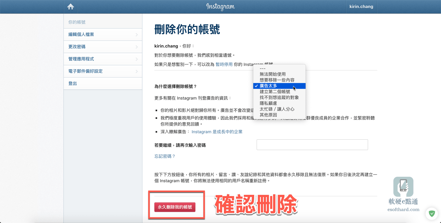 第二步:從「為什麼選擇刪除帳號?」旁的下拉式功能表中選擇理由(必須先從功能表中選擇理由,才會看到可以永久刪除帳號的選項。)選擇完成後重新輸入您的密碼。而他們對於每一個刪除原因都有提出相關問題解決辦法,個人覺得都蠻貼心實用的,大家可以好好考慮一下XD